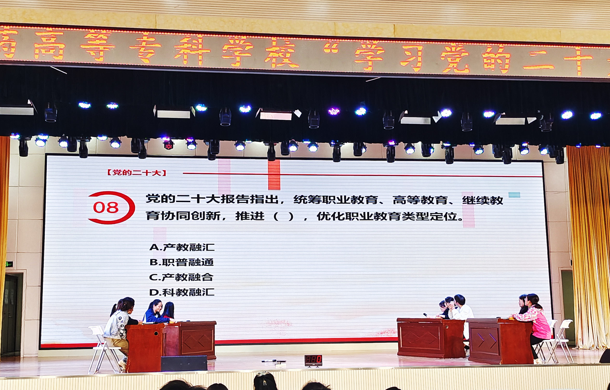 为认真学习宣传贯彻党的二十大精神,营造良好学习氛围,2023年3月29日下午3点,由马克思主义学院、校团委共同主办,宣传统战部、学生工作部协办,马克思主义青年研习社承办的“学习党的二十大精神”知识竞赛活动在北区礼堂举行。宣传统战部部长杨磊、学生工作部部长郭英辉、马克思主义学院副院长程征以及校团委、各学院团总支书记、马克思主义学院教师以及各学院300余位学生代表出席了活动。