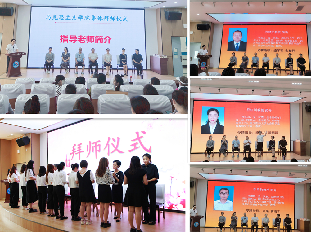 (二)集体拜师仪式。为帮助新进教师又好又快成长,按照学校要求,学院提前安排了院内师德高尚的副高以上7人作为指导老师,与新进教师进行师徒结对。主持人邀请指导教师统一上台落座,并一一介绍了指导教师的简介。各指导教师为新进教师赠予了相关业务书籍,新教师行拜师礼鞠躬答谢。全体教研室主任为导师颁发了聘书。一份聘书,承载着期许和责任。指导教师们表示:将用自己“学高为师,身正为范”的作风以及对思政工作的热情感染新进教师,做好引路人和传帮带工作。相信在指导老师的教导下,新进教师们能早日成长为一名合格的思想政治教育工作者。