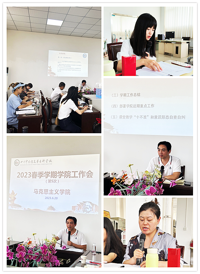 二、学院工作会议。(一)程征传达近期我校各项工作会议和文件精神。包括《四川中医药高等专科学校教职工准入查询工作实施方案(试行)》《2022年秋季学期教研活动检查通报》《学术不端自查清理工作的通知》《主题教育征文活动的通知》等文件与会议的精神,重点汇报了《关于解决我校升本工作期间工作量补足工作方案(征求意见稿)》的情况。(二)学院和教研室学期工作总结。一是心理健康教研室段青青主任、卫生法规教研室刘薇主任、形势与政策教研室孔丽主任、思想道德与法治教研室张羽主任、概论课教研室杨羚主任分别代表本教研室作学期工作总结。程征肯定了各教研室取得各项成绩,同时提出了工作改进要求和下一步教研室建设的重难点问题和措施。二是程征作本学期学院工作总结,指出2023年是全面贯彻党的二十大精神开局之年,马克思主义学院始终坚持以习近平新时代中国特色社会主义思想为指导,以日常教学、教学比赛、科研项目、队伍建设为抓手,坚持踔厉奋进、稳中求进,循序渐进,久久为功,推动课程建设和教学团队高质量内涵式发展,着重就以上各方面的计划完成情况、阶段成果、下步措施做了总结发言。(三)部署学院近期重点工作。程征对期末考试和监考工作、“精彩一课”备赛、暑期研修工作等作相关部署和要求。强调要加强考风考纪,教师监考工作要保质保量,确保期末各项工作平稳顺利完成。(四)课堂教学“十不准”和意识形态自查自纠。强调全体教师尤其是党员教师要进一步增强责任感和使命感,提高政治站位、强化政治担当,守好一段渠,种好责任田,在马言马,在马信马,以高度政治责任感和爱国情怀做好本职工作。