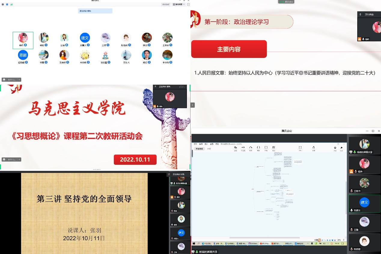 第二阶段,《概论》课教研室主任杨羚主持集体备课。第一项为杨斌老师围绕《坚持和发展中国特色社会主义的总任务》的内容为老师们作专题辅导。第二项为张羽老师分享了关于《坚持党的全面领导》的备课内容。第三项为教师自由讨论环节。参会老师针对杨斌老师、张羽老师讲授的内容畅所欲言、各抒己见,把自己的想法、经验、困惑都提了出来,在思想的碰撞中擦出集体火花。第四项为近期参加培训的教师代表 分享心得。王璐老师参加了“高校教师课堂教学能力提升”的线上培训。杨羚老师参加了《概论》课教案设计与展示的线上培训。两位老师都一致认为思政课教师只有具备深厚的家国情怀、仁爱情怀、传道情怀,才能完成铸魂育人的重大使命。思政课教师具有深厚的家国情怀才能引领学生成长,思政课教师具有博大的仁爱情怀才能滋润学生心灵,思政课教师具有执着的传道情怀才能启迪学生智慧。