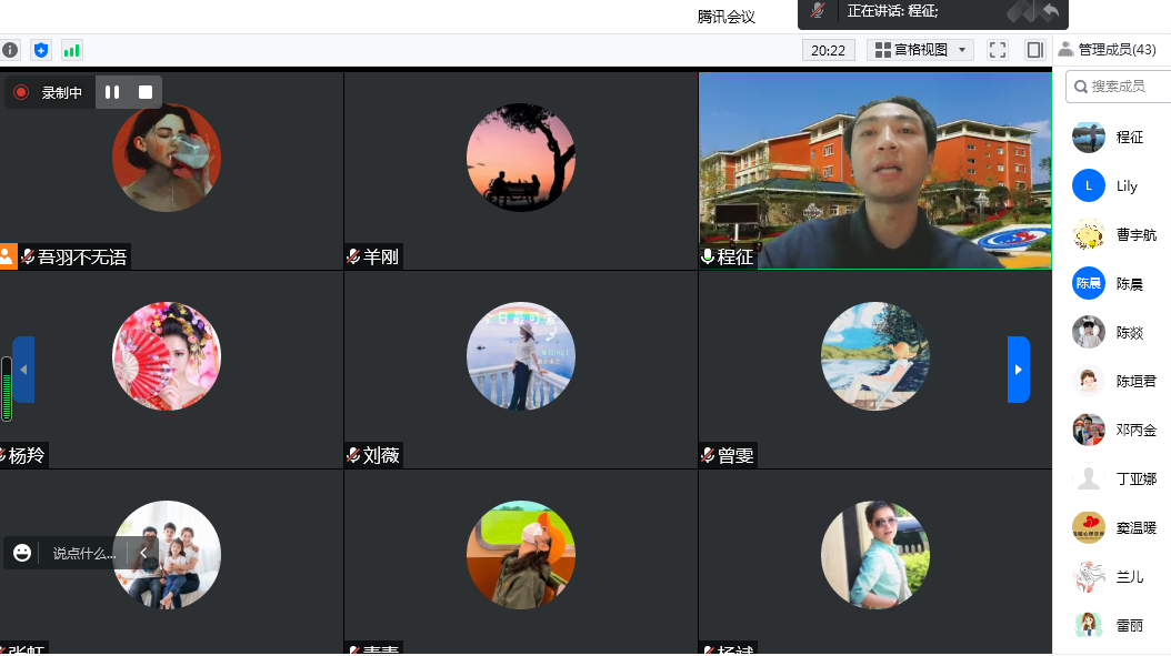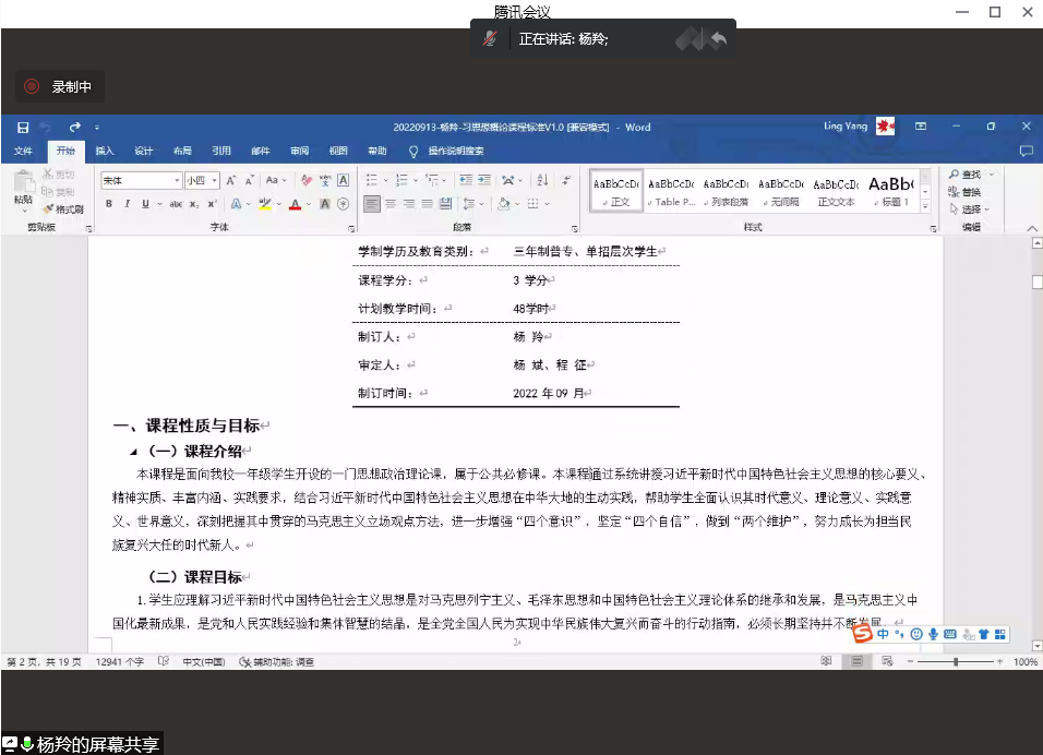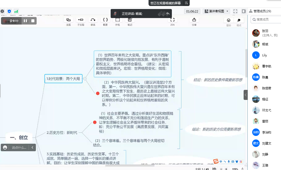 第三阶段,全体教师商讨《习近平新时代中国特色社会主义思想概论》教学事宜。第一步:毛丹妮老师对教学资源提出一些细节误差。第二步,李治钧教授提出各教师在网课过程中注意培养学生政治素养,把握好新生第一次网课教学效果。第三步,刘建文教授提出此次网上会议效果显著,杨斌院长备课思路清晰,各教研室主任准备资料详实。叮嘱大家在教学过程中提升教学质量,并且分享很多素材在群共享里,方便大家在教学过程中使用。第四步,本学期唯一一个本科班《思德法》课程教学任务安排给了吴维维老师,吴维维作为年轻教师,也分享了自己在课前备课的心路历程,并且提出实践活动项目中进行修改的内容,希望马院大家庭给予帮助。