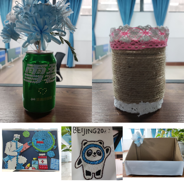 2021级中药材生产与加工专业单招1-3班的同学们在王咏华老师的带领下,积极参与,集思广益,发挥聪明才智,通过两个月的准备,将不使用的口罩、纽扣、包裹箱、矿泉水瓶等废弃物品再次利用,制作成了实用的抽纸盒、笔筒、收纳盒等,装饰品香囊、北京冬奥会吉祥物冰墩墩等物品,以实际行动践行绿色环保理念。